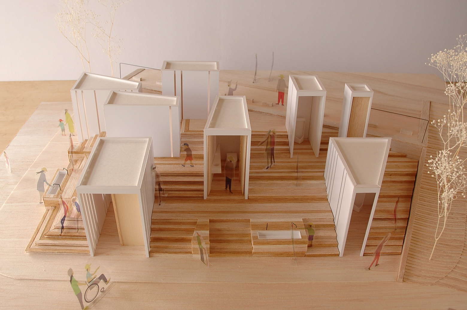 国立公園内の公衆トイレの計画。敷地の段差を利用し、段状のランドスケープの中にトイレブースを設けることで、休憩したり遊んだり景色を楽しめる場所にします。行き止まりがなく開放的でありながらレベル差による距離感が生まれ、防犯の徹底とプライバシーの確保を両立させます。また、段下の換気システムにより、階段上を流れる風によって自然換気が行われます。