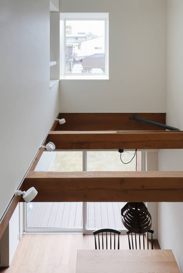 築40年超の事務所併用住宅の改修計画。京都に特有の鰻の寝床状の敷地に、吹抜を中心に家族それぞれの気配が感じられる住まいを計画しました。そこで、既存建物の架構を活かしながら風や光が建物全体を満たすように各スペース同士をつなでいます。また、間口5.4mの既存建物を2.7mづつに分割し、住まいにたくさんの居場所を設けています。